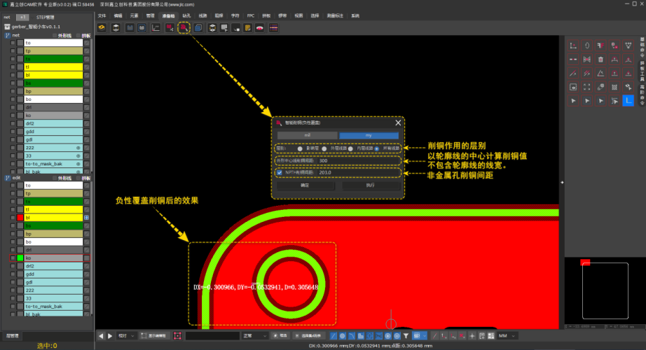 此命令的作用是对指定的线路层,按当前工作层里的轮廓线中心或当前选择的轮廓线中心,以负性覆盖的形式,进行削铜处理。