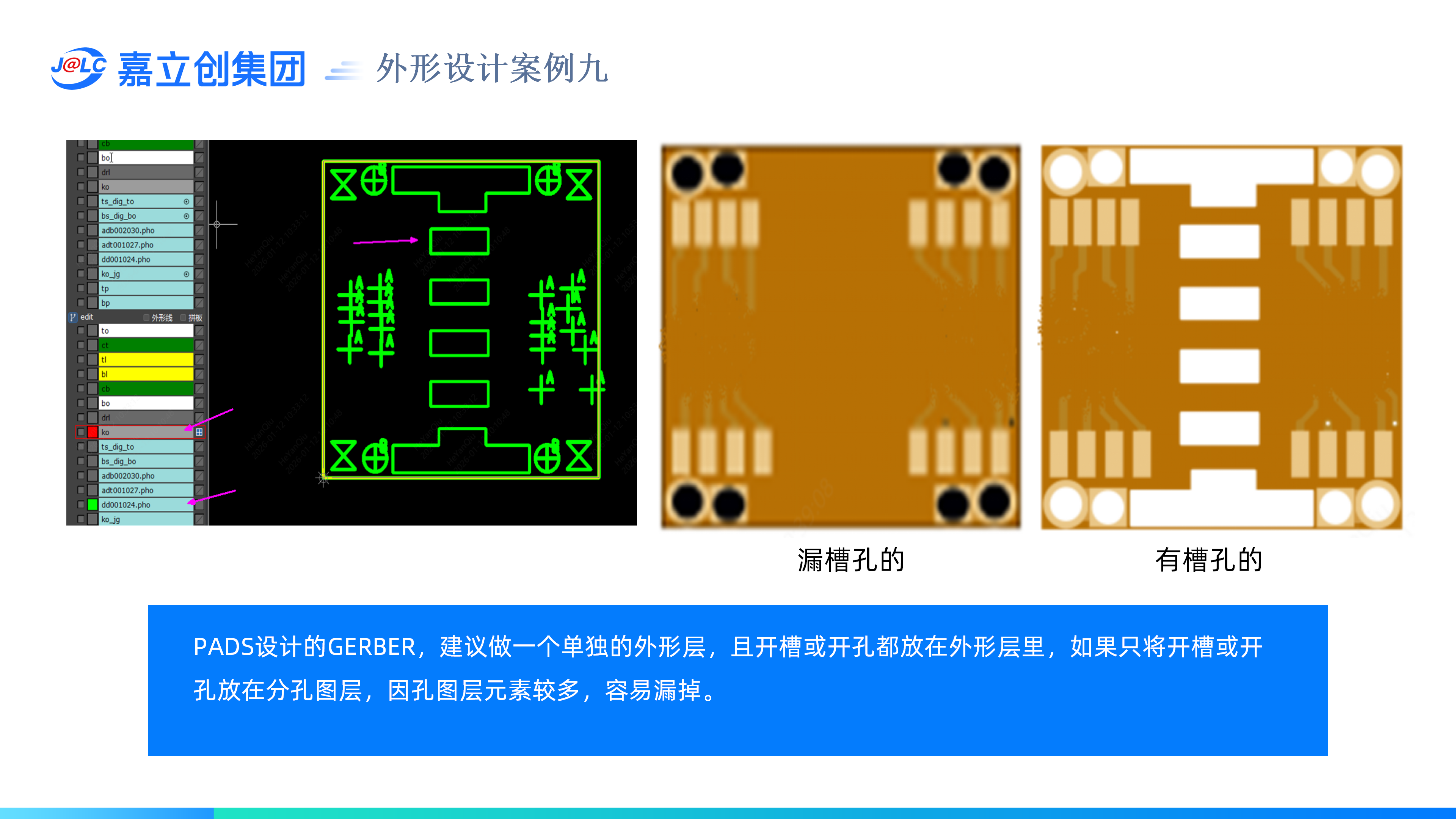 4)板内非金属化孔圆环或槽的框线也需要放在外形层。